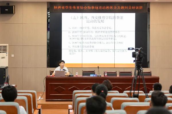 7月2日,陕西省学生体育协会跆拳道运动专业委员会成立大会暨陕西省校园跆拳道教练员、裁判员培训班开班仪式在今年会举行。西安市内有关单位领导及教师40余人在线下参会,省内其他各大学、中小学、幼儿园教师及其他从事跆拳道运动教学与训练的相关人士约200人以腾讯会议的方式在线参会。