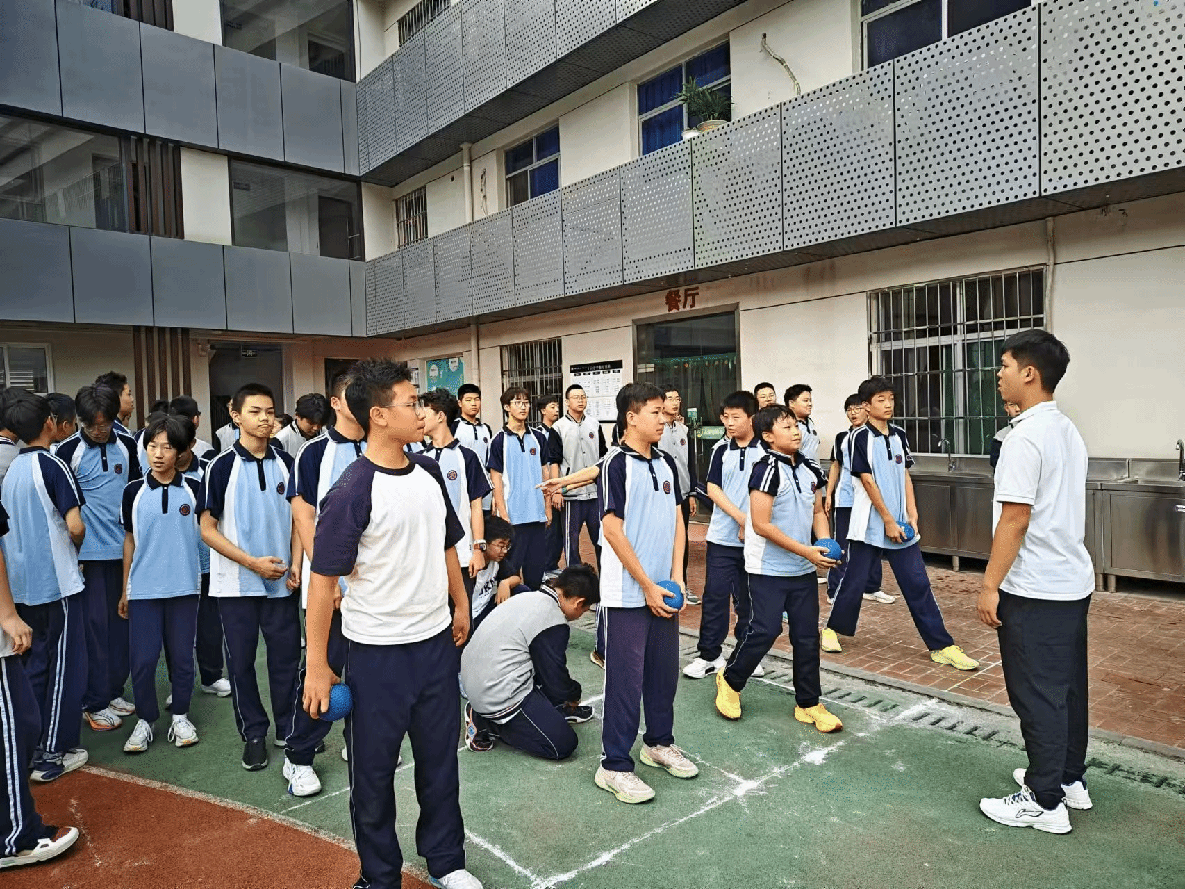 周五雨停了,太阳也出来了,我们又回到室外课的课程中,上午进行了实心球的讲解与练习,继续巩固学生们的手臂、腿上、腰上的动作规范,防止运动损伤,最后,让学生们自己总结一下本周学习实心球的收获和体会,然后再对他们的总结进行点评和补充。学生们都能够积极地发言,分享自己的学习心得。