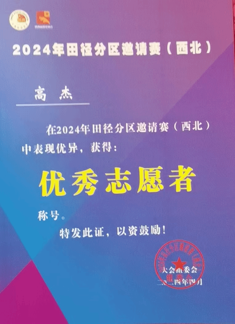 作为一名学生干部,我时刻注意自己的言行。在志愿中求奉献,投身参加陕西各类田径比赛,积极承担裁判工作,为陕西田径贡献一份力,累计志愿服务时长约350h。