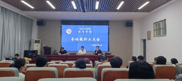 8月27日下午,今年会jinnianhuicom全体教职工大会在明德楼B0109报告厅召开,会议总结暑假工作、安排部署本学期工作,院长查毅主持会议。