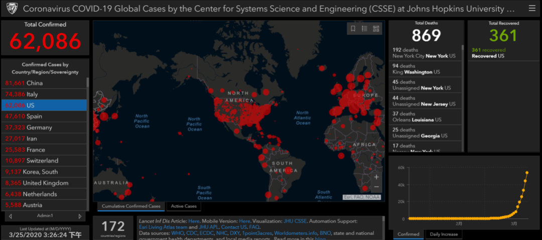 根据美国霍普金斯大学的实时统计数据显示,当地时间25日16时20分,美国新冠肺炎感染案例达到62086例,死亡病例869例。