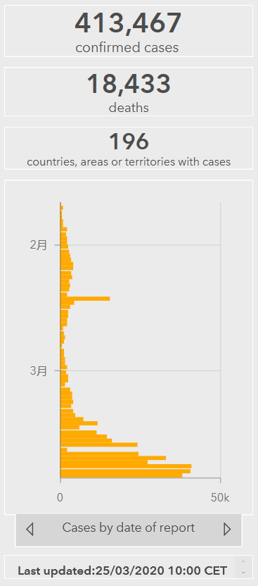 世卫组织实时统计数据显示,截至欧洲中部时间3月25日10时(北京时间3月25日17时),全球确诊新冠肺炎413467例,死亡18433例。目前全球已有196个国家地区出现新冠肺炎病例,中国以外新冠肺炎确诊超过33万例。