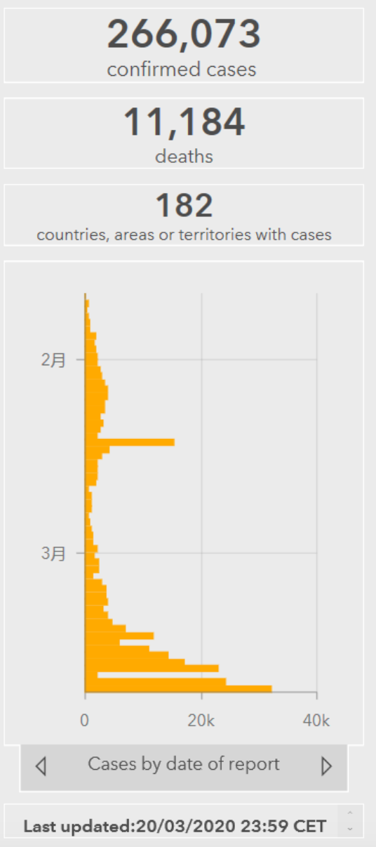 世卫组织发布最新一期新冠肺炎疫情每日报告显示,全球在过去24小时内新增32000例新冠肺炎确诊病例,死亡人数新增1344例。截至欧洲中部时间3月20日23时59分(北京时间21日6时59分),全球确诊新冠肺炎266073例,死亡11184例,目前全球已有182个国家地区出现新冠肺炎病例。